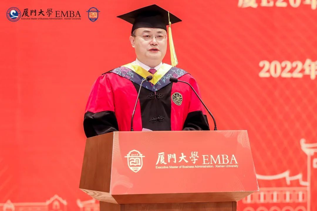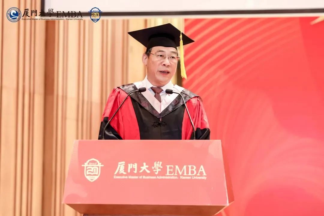 张荣在致辞中祝贺同学们圆满完成学业,并叮嘱大家无论何时何地,永远不要忘记厦大人的家国情怀、自强追求、创新精神、感恩品格。他表示,百年校庆期间,习近平总书记发来贺信,充分肯定学校秉持陈嘉庚先生立校志向,形成“爱国、革命、自强、科学”的优良校风,并为学校新百年建设与发展提供根本遵循。张荣希望同学们进一步传承母校优良校风,肩负企业家社会责任,主动服务国家战略、服务地方发展、服务民生福祉,在各自的领域展现新作为、作出新贡献。张荣勉励同学们要厚植家国情怀,涵养世界眼光,时刻保持勤于学、善于思的求知热情,坚持做创新发展的探索者、组织者、引领者,积极参与和推动科技强国、人才强国、经济强国战略落地落实;要从感恩家人、感恩老师、感恩校主、感恩母校,升华为感恩时代、感恩国家、感恩民族,把握时代脉搏,保持生机活力,走在时代前列,争做新时代的商界精英。