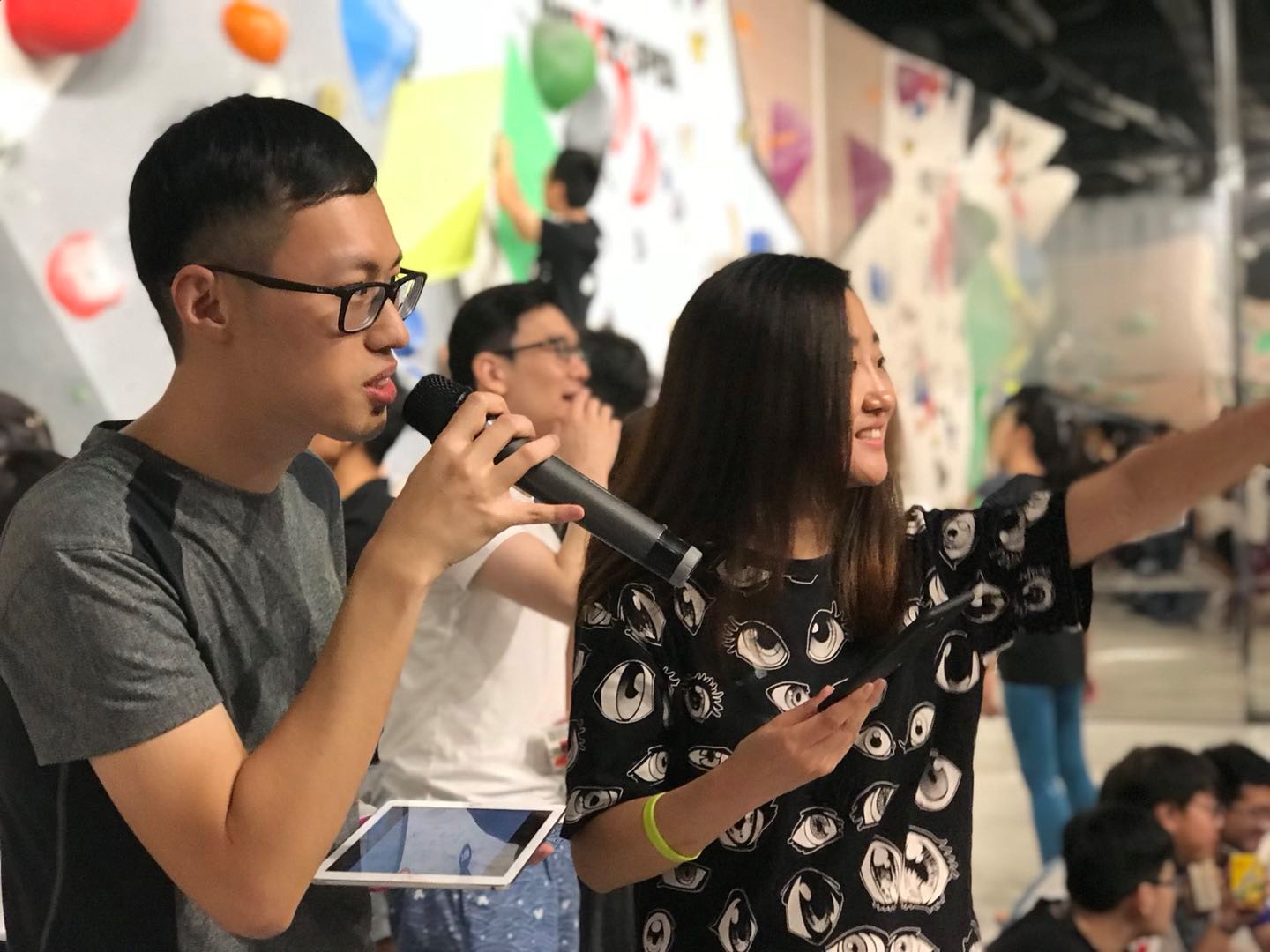 趣味活动现场:主持人蔡世嘉和伍叶(右)