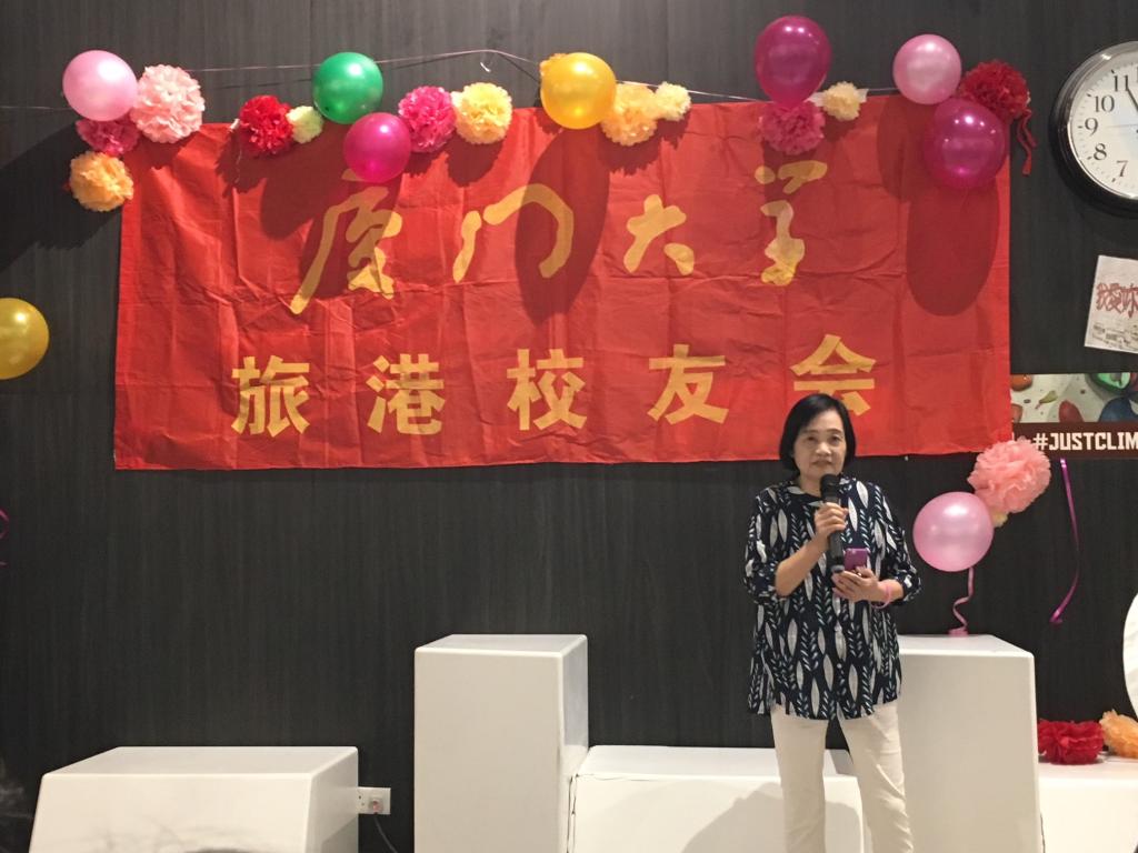 来港30年的徐兰芳名誉理事长代表老学长讲话。她说,30年来,和广大旅港校友一样,始终心念母校,情系厦大。看到年轻校友格外亲切和开心,对年轻人始终有一份特殊的感情。看到新来港的厦大年轻校友,总会勾起对校园生活、青春岁月的回忆,更忘却了自己即将迈向古稀之年。她希望新校友来港后,铭记“自强不息、止于至善”的校训,在香港这繁华的城市里,不忘初心,明确自己来港学习的目标和方向,闹中取静,努力完成学业,为将来新的前进目标打下坚实的基础。她热忱叮嘱新来港校友在港期间,如果遇到困难和问题,欢迎找校友会,学长们愿意互相陪伴和分忧解难;有什么好事和喜事,也可以知会校友会,大家可以一起分享喜悦,因为校友会是校友们共同的家。