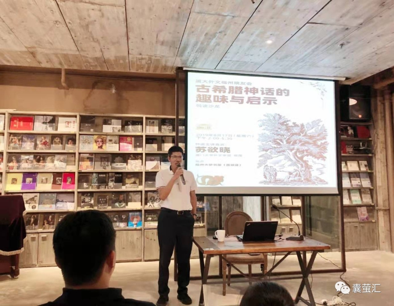 8月17日下午,大梦书屋,西子湖畔,福州校友会外文分会第六期悦读文艺沙龙如期而至。本次悦读沙龙的主题是“古希腊神话的趣味与启示”,特邀厦门大学外文学院苏欲晓教授担任主讲嘉宾。活动由2005级英语系硕士梁丽娥主持。