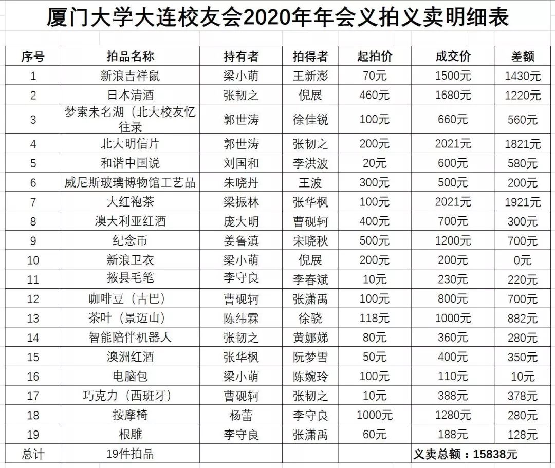 拍得善款承载着我厦校友和到会兄弟院校校友会嘉宾的一片爱心,将纳入大连校友会第八年度助学基金,向在母校就读的辽宁籍家境贫寒、敦品励学的学弟学妹们提供资助。