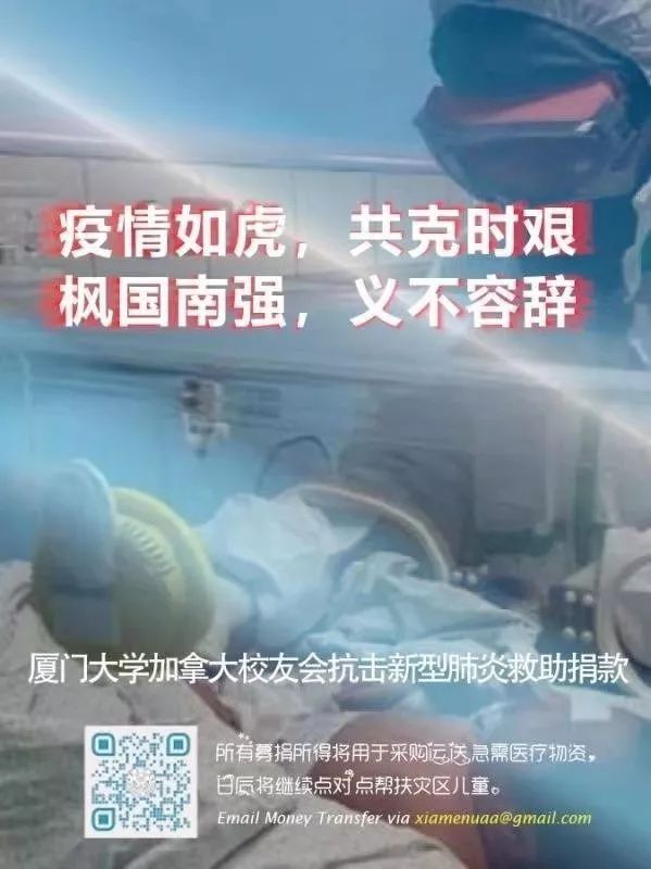 这次支援疫区的活动,本来预计从捐款、购物到物流至少需要2周时间,但厦门大学加拿大校友会却在短短的2天内完成了第一项重要的任务,高效率地把捐款购买的物资对接到一线医院。厦门大学加拿大校友会倡议的捐款仍在继续增加,爱心传递仍然在延续。