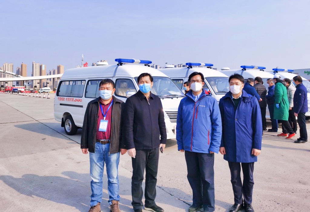 四位厦大校友代表也抓紧时间在救护车前合影留念,带着某种说不出的自豪感,也带着似乎要奔赴战场前的那种决心与急切。马上,这四辆救护车,就要去到各自的医院,并投入到救治病人的战斗中去了!