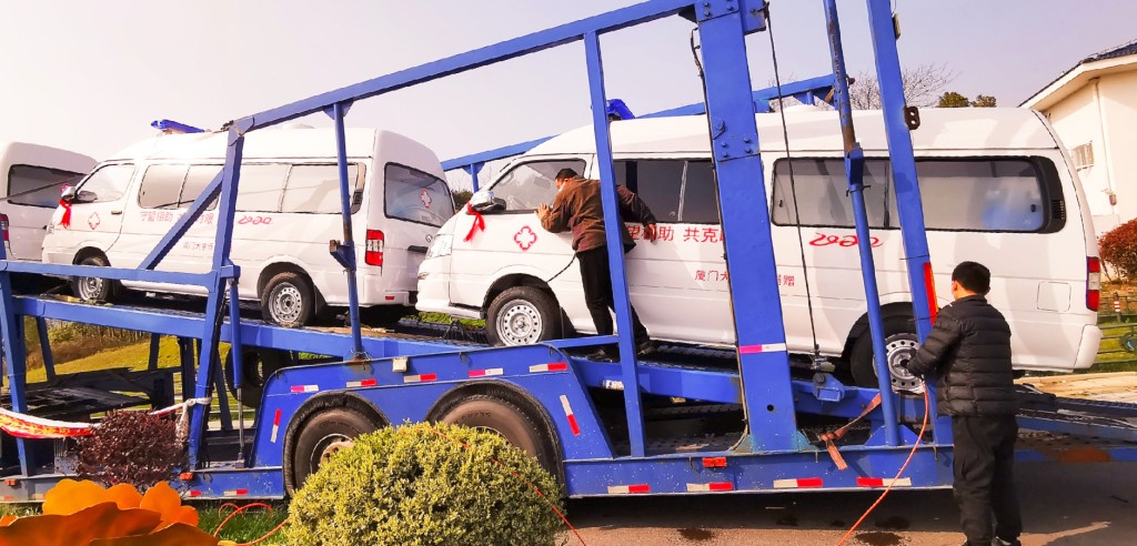 不一会,一辆专门拖运汽车的巨型卡车缓缓从高速公路路口出来,蓝色的托架上,四辆白色的救护车一字排开,煞是好看。车子停稳后,可以看到车厢上印着红色的两排字,上一排写着:“守望相助 共克时艰 2020”,下一排用小一号字写着:“厦门大学师生捐赠”。
