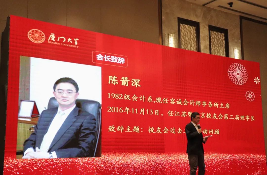接着由厦门大学江苏暨南京校友会现任会长陈箭深先生上台致辞。回顾过去一年工作,展望明年发展目标,更好地为母校、为校友做好服务工作,凝聚每一份贡献力量。