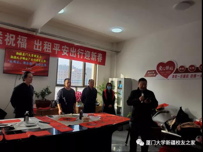 活动由厦门大学新疆校友会监事长陈俊玲主持,校友会会长王小江致辞:“新疆厦门大学校友会秉承‘自强不息,止于至善’的校训,积极为新疆的各项事业贡献力量,今天我们用送春联的这种形式就是为了弘扬中华传统文化,表达对劳动者的敬意。书法家们挥毫成对,泼墨成联,用“新桃”换旧符,遍撒春意,祝福新年。过年的氛围立刻充溢在所有人的心间。心有所思,情为所动,数九寒天也挡不住我们向普通劳动者致敬的热忱,因为你们的微笑与辛勤工作铺就了通达与便捷,让昌吉连接四面八方。世界上劳动者最光荣,我们应该有一份感激的情愫。祝愿在新的一年里,所有人虎虎有生气,日子红红火火,一切平安随顺”。