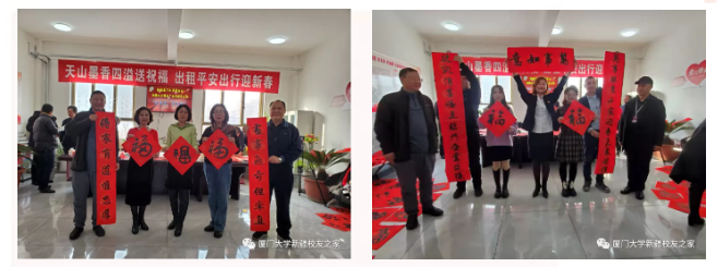 昌吉公交出租车分公司经理和两名司机师傅踊跃发言,表达了对厦门大学新疆校友会的感激之情。师傅们手持“虎步奔腾开盛世,春风浩荡展宏图”“黄牛虽去精神在,猛虎初来气象新”等寓意美好的春联,拍照合影,在一片欢声笑语中结束了活动。