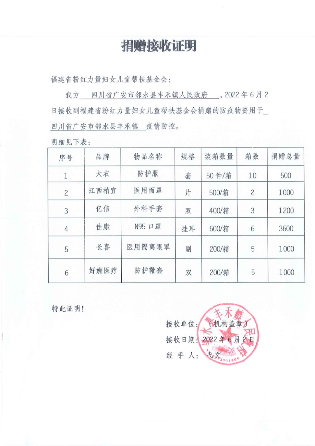经过近一周的跋山涉水,6月2日,防疫物资抵达邻水,由四川省广安市邻水县丰禾镇人民政府接收,这批带着粉红力量抗疫决心的防疫物资,将投入到四川省广安市邻水县丰禾镇的疫情防控当中。