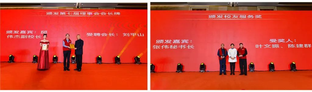 随后,与会嘉宾为新一届理事会、监事会负责人授牌。刘平山宣读聘任叶文振、陈建群为名誉会长的决定,余少谦宣读聘任副秘书长的决定、公布秘书处财务部、公共事务部、会员管理部、机构管理部、校友联谊部等负责人名单。张伟向叶文振、陈建群校友颁授“厦大校友服务奖”。