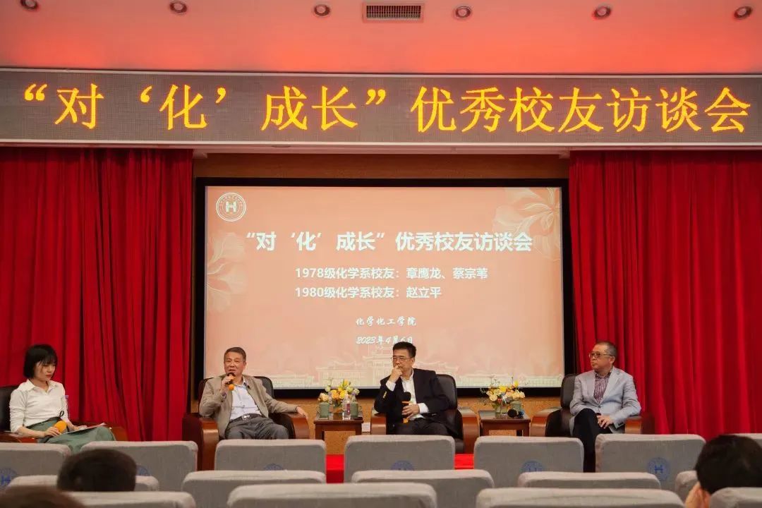 为了充分发挥优秀校友的榜样力量,激励学生奋发进取、励志成才,值厦门大学建校102周年之际,4月6日下午,化学化工学院在化学报告厅举办“对 ‘化’成长”优秀校友访谈会。本次活动特别邀请化学系1978级校友、粤港澳大湾区厦门大学化学化工校友会会长、厦门大学深圳校友会化学化工分会会长、深圳金家工贸服务有限公司总经理章鹰龙,化学系1978级校友、厦门大学旅港校友会副理事长、粤港澳大湾区厦门大学化学化工校友会联席会长、香港浸会大学化学讲座教授、环境与生物分析国家重点实验室主任蔡宗苇,以及化学系1980级校友、厦门大学厦门校友会化学化工分会会长、厦门凯纳石墨烯技术股份有限公司董事长赵立平和同学们面对面对话交流。活动共吸引200余名学生参加。化学系2021级硕士张昕然主持访谈会。