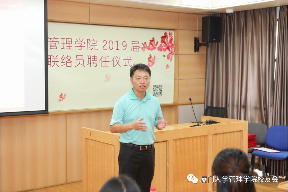 首先于李胜副院长上台进行了致辞。于副院长向联络员的顺利毕业表达了祝贺,并强调了校友会一直牢记着“情系厦大学子,弘扬嘉庚精神,研习商学文化,助力共同成长。”的使命,希望我们的校友联络员可以传达这样的精神,带领广大校友加入到共建学院的队伍中去。