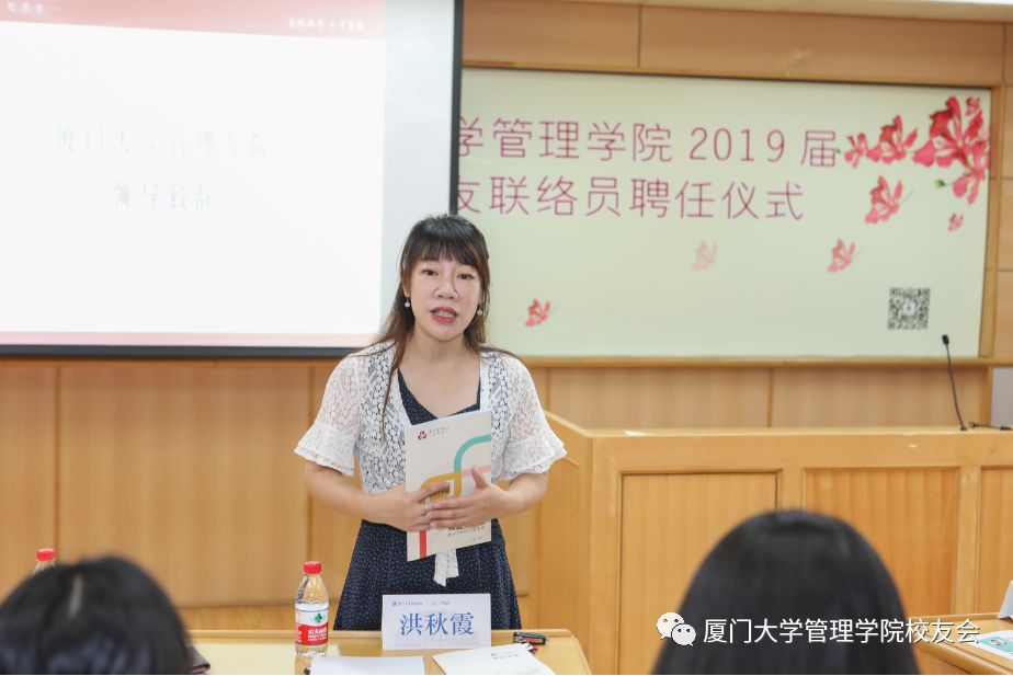 随后进行了联络员的聘书颁发仪式,同学们身着定制T恤,接过老师递来的聘书,从此成为管院联络员大家庭的一员。2019届联络员代表苏菲菲同学为此表达了自己的感受,从代表学院参访联络员到成为联络员角色的转变让自己很感激,管理学院心系每个走出去的学子,为他们送去温暖,而情感是双向的,作为联络员的他们也会牢记自己的使命。