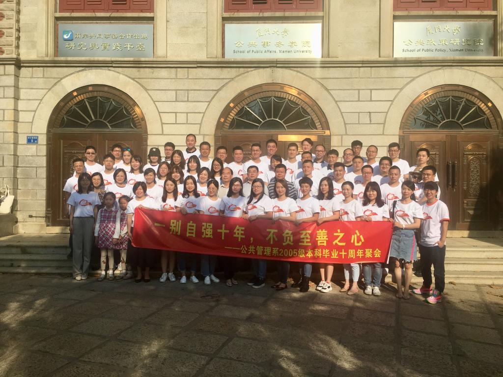 2019年11月09日下午,公共事务学院举办了“2005级公共管理系本科班毕业10周年返校交流会”,党委书记黄新华、院长朱仁显、副院长罗思东与2005级公共管理系本科班六十余名毕业生一起进行了交流。