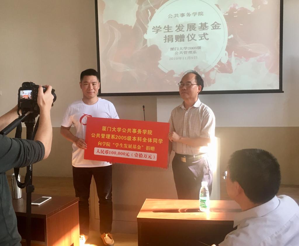 近年来,公共事务学院一直在筹划成立“学生发展基金”,经与学院领导、学校教育发展基金会沟通,2005级同学全体计划筹措一笔资金10万元作为第一批启动资金注入“学院学生发展基金”中,此项基金将用于学院学生今后到国外一流大学交流学习、国际组织实习担任义工、大型央企、国家部委实习以及社团活动、奖助学金等学生综合发展的资助经费。学院今后也将通过企业捐赠、校友捐赠、国家经费配套支持等方式不断充实壮大基金。朱仁显作为学院代表接受了05公管同学们的这份心意。