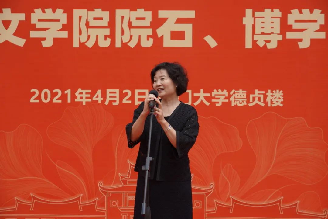 詹心丽为揭幕仪式致辞。她代表校友总会对外文校友慷慨捐资、襄助母校事业发展的善举表示高度赞誉和衷心感谢,并希望通过此次外文学院院石、博学亭揭幕仪式进一步凝聚校友力量、弘扬嘉庚精神,奋进厦大百年新征程。