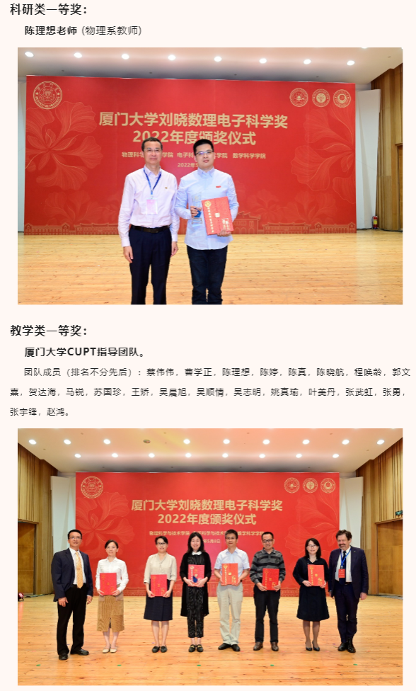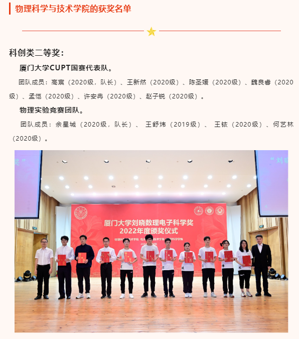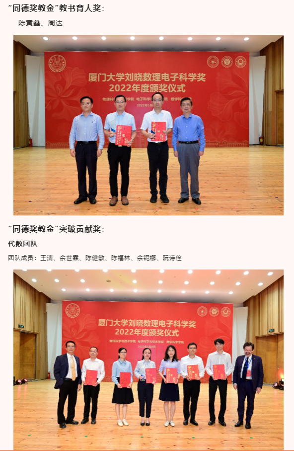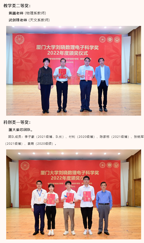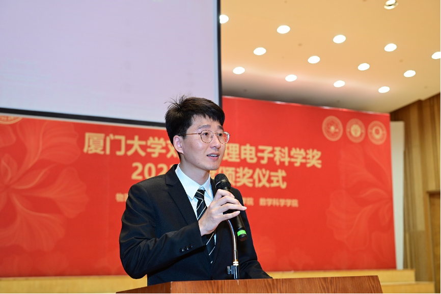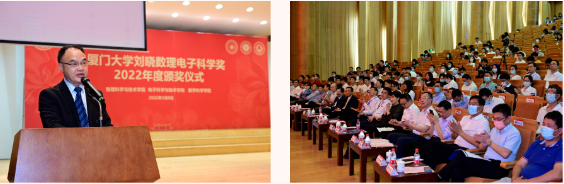 此外,出席本次颁奖典礼的还有物理科学与技术学院党委书记李书平,党委副书记郑诚明,副院长陈理想,副院长陈张海,副院长黄凯等老师;电子科学与技术学院院长陈忠,党委副书记方银水,副院长董俊等老师;数学科学学院党委书记黄宝秋,厦门大学南强杰出贡献奖获得者、数学科学学院钟同德,党委副书记毛通双,副院长张剑文,副院长金贤安,副院长宋翀等老师。以及三个学院获奖师生和学生代表参加了颁奖典礼。颁奖典礼由物理科学与技术学院党委副书记郑诚明主持。