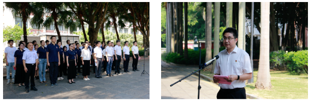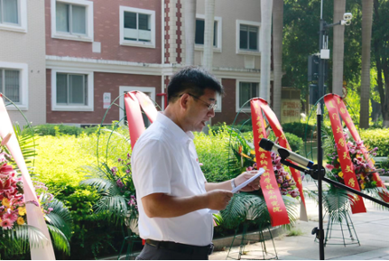 “自强!自强!学海和洋洋!”在激扬的校歌声中,纪念仪式正式开始。江云宝副校长回顾萨本栋先生的生平事迹,并致以崇高的敬意。