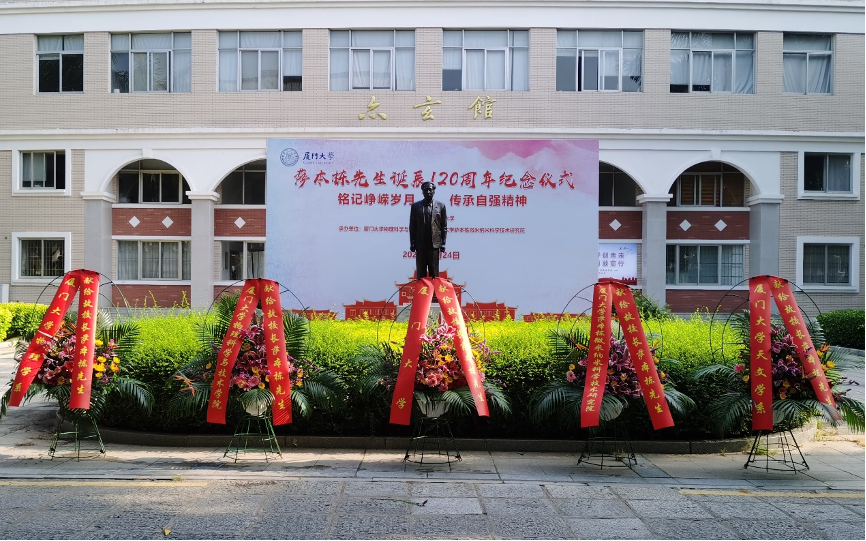 随后,举行献花仪式。厦门大学副校长江云宝、物理科学与技术院长陈张海、萨本栋微米纳米科学技术研究院副院长王敏、物理科学与技术学院副院长吴顺情、物理科学与技术学院副书记郑诚明上前整理花篮缎带。全体师生面向萨本栋铜像深沉鞠躬,并环绕塑像一周进行瞻仰与缅怀。
