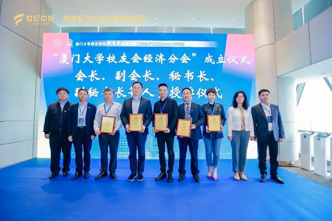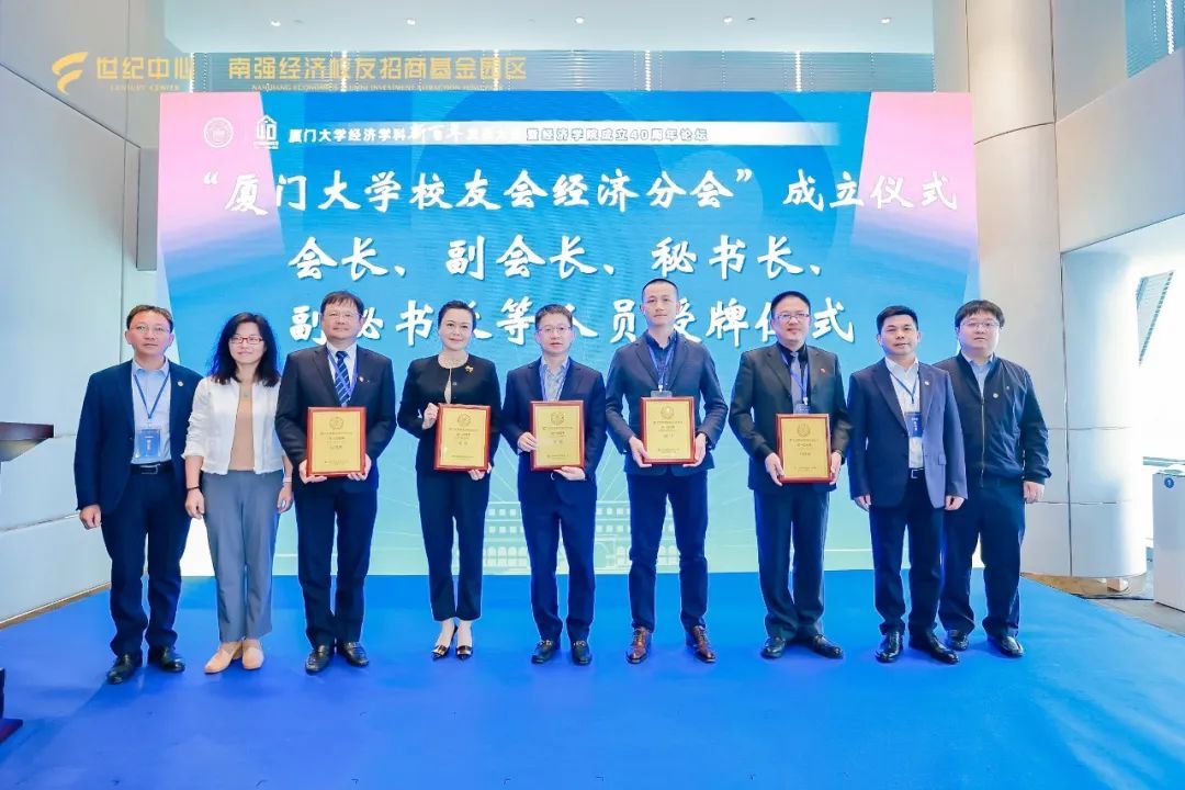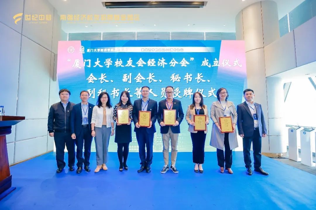 经济学院副院长彭水军、谢贞发、林明,经济学院党委副书记周蕾为经济分会众理事授牌