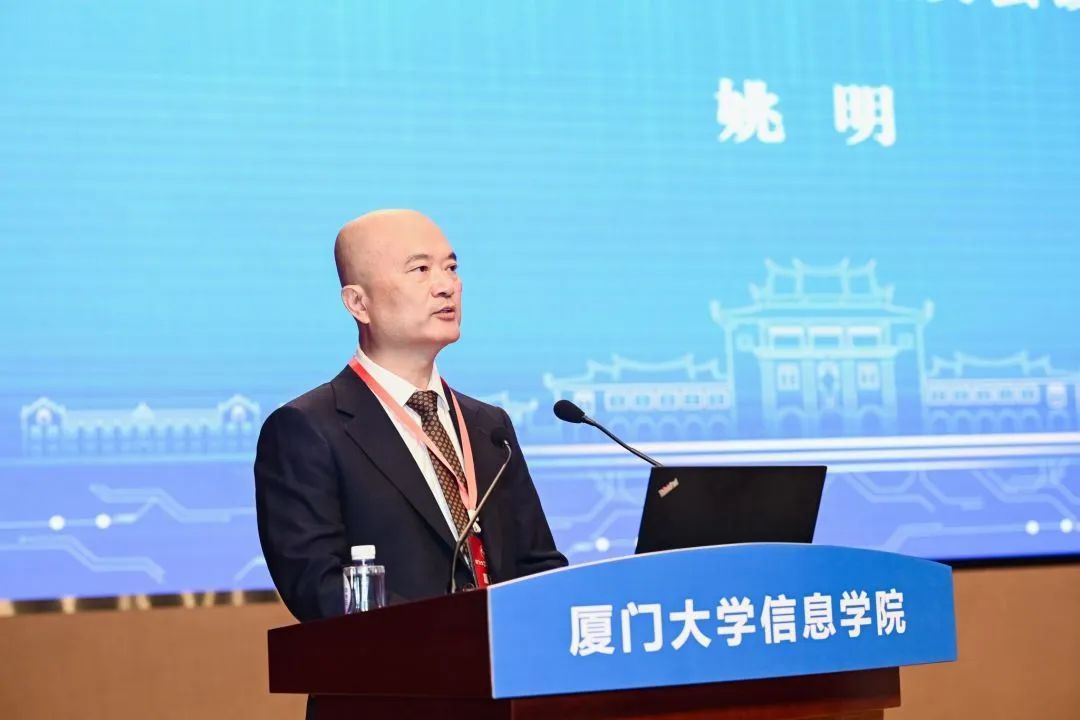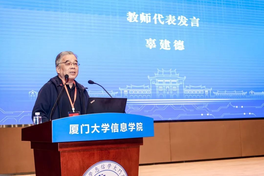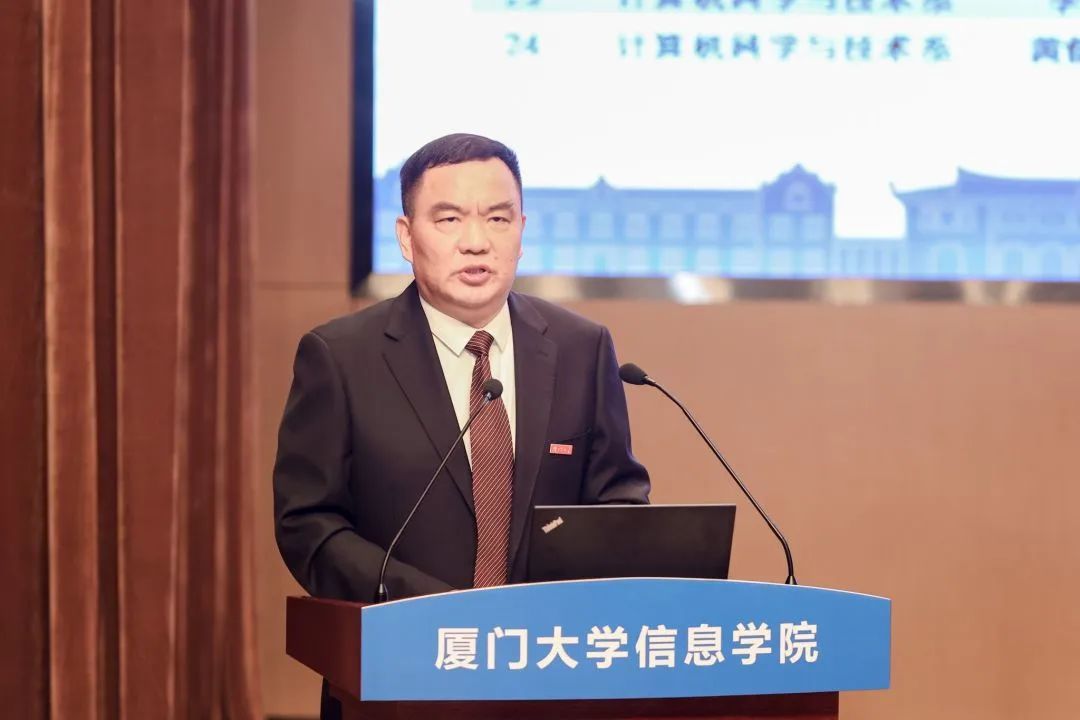 信息学院院长舒继武首先致辞。他回顾了厦门大学信息学院的发展历史,特别是2019年,学校优化重组信息科学与技术学院与软件学院成立信息学院以来,学院取得的主要发展成就。