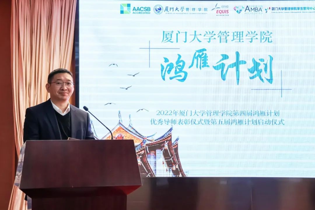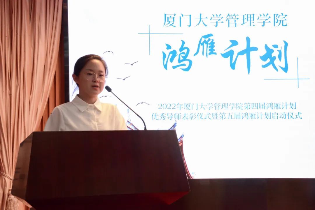 2022年12月9日晚上19点30分,厦门大学管理学院第四届鸿雁计划优秀导师表彰仪式暨2022年第五届鸿雁计划启动仪式在科学艺术中心一楼多功能厅顺利举行。厦门大学校友总会秘书处秘书长张伟、管理学院副院长白云涛、管理学院党委副书记戴蓥、校友总会秘书处联络部主任李绍玉、管理学院职业发展中心主任王燊、管理学院团委副书记揭上锋以及第四届鸿雁计划优秀导师代表、第五届鸿雁计划导师与学生代表出席了本次活动。仪式由管理学院兼职辅导员李奕凡主持。