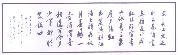 三、论其风采,则行气贯通,字字排列得当。字势大小、长短、肥瘦、宽窄,搭配自然,且表现出参差变化。特别是突出书法的“避让”,如“远”字的空处,让给“知”字进驻,“平”字竖笔一竿插到底,别具一格,令人叫绝。整幅十四字—气呵成,给人以无穷的遐思和强烈的艺术感染力。