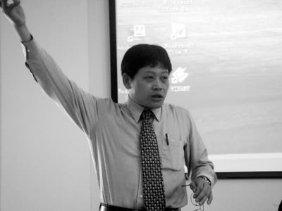 初见胡金定教授,绝不是一个“学者”形象,他西装革履,穿衬衣打领带,但手提公文包上却挂着一个小小的哆啦A梦。他讲话时,总有很多可爱的小动作:挠头、摸眼镜、摇椅子。他喜欢透过厚厚的镜片从下往上瞅着人。他爱笑,声音爽朗,时不时说两句幽默的厦门话。他的课堂笑声不断,就连他参加考试讲课给考官听,也能把考官给逗乐。