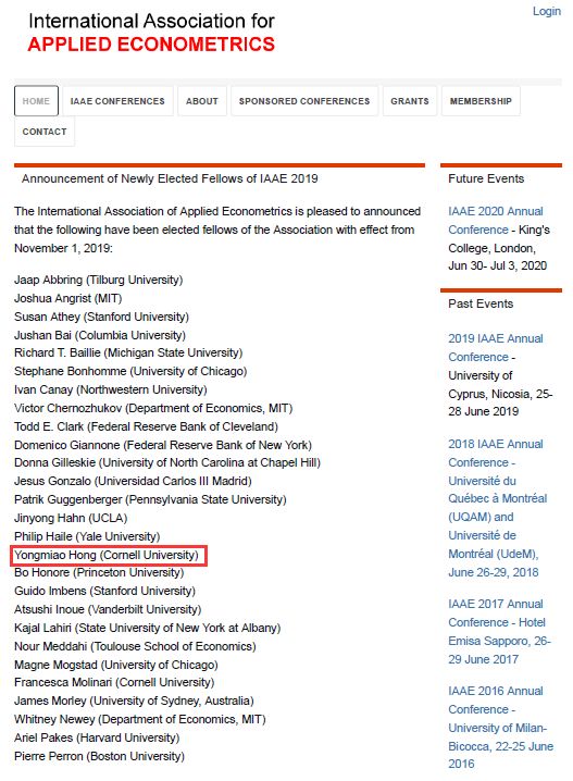2019年11月1日,国际应用计量经济学会(IAAE, International Association for Applied Econometrics)官方网站正式公布,洪永淼教授当选该学会会士(Fellow)。