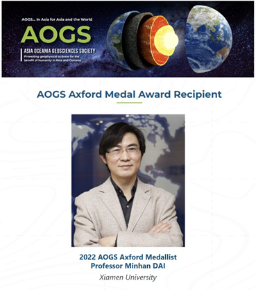 2022年6月15日,亚洲-大洋洲地球科学学会(Asia Oceania Geosciences Society, AOGS)公布了“艾克斯福特奖”(Axford Medal)2022年度获奖人选,厦门大学近海海洋环境科学国家重点实验室、海洋与地球学院戴民汉教授荣获该奖项。戴民汉教授是首位获此殊荣的海洋学家,也是大陆第二位获此奖项的地球科学学者。