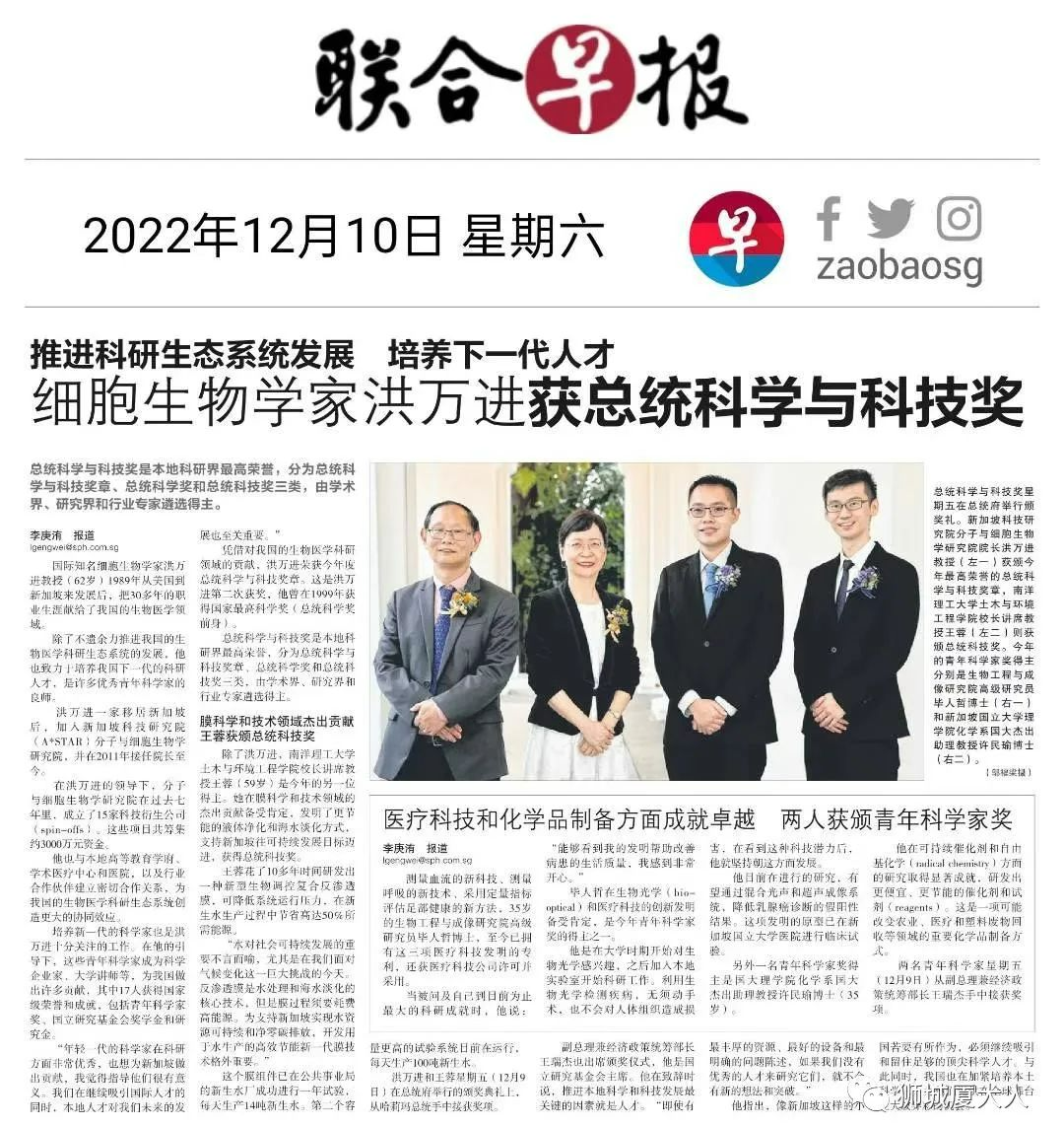12月9日,新加坡2022年科研总统奖揭晓,我校1982届生物学系校友、新加坡国立大学教授、新加坡国家科技研究局分子与细胞生物学研究院院长洪万进教授荣获总统科学与科技奖。