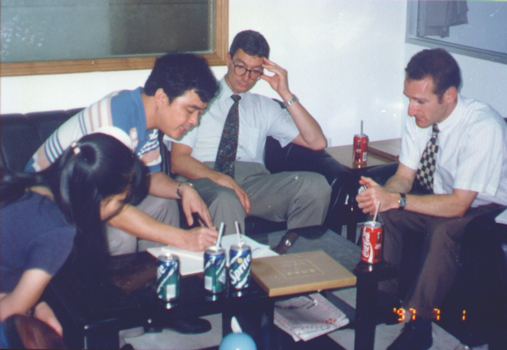 蓝伟光(左二)与英国泰晤士水务集团的膜技术专家一起探讨膜应用工艺