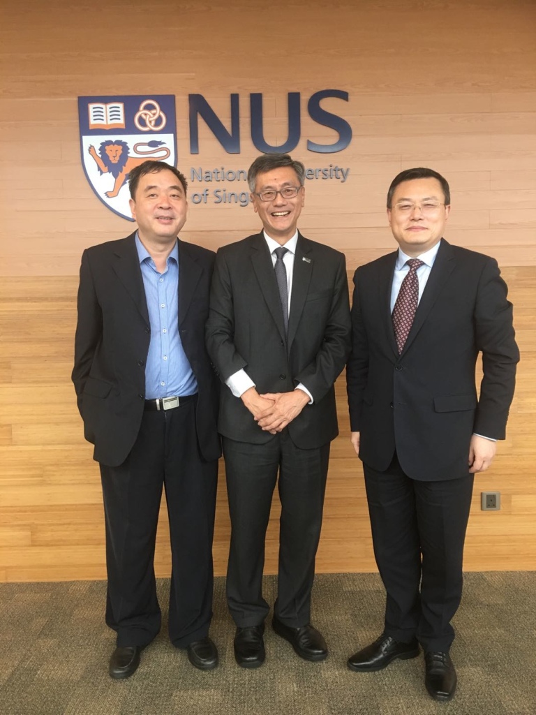 2018年3月,蓝伟光(左一)为母校厦门大学与新加坡国立大学的交流合作牵线搭桥,与厦门大学校长张荣教授(右一)、新加坡国立大学校长陈永财教授(右二)合影