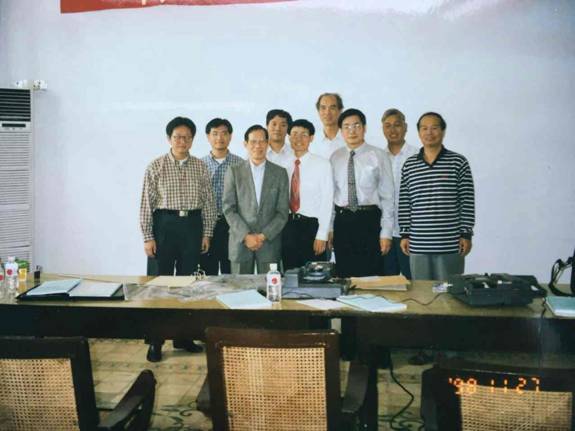 1998年,周振参加化学系博士答辩会,从左至右为郑兰荪院士、江云宝教授、黄本立院士、庄峙厦教授、周振、季欧教授、杨芃原教授、洪阿实教授。