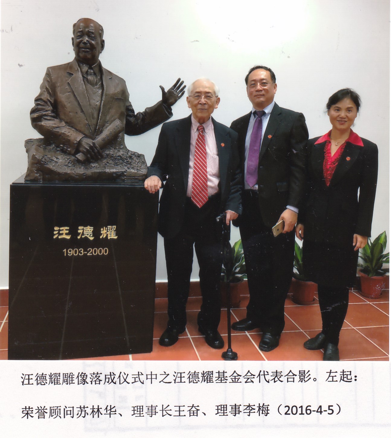 95周年校庆大典前一日(即2016-4-5)下午,校方为服务厦门大学近六十年之汪德耀前校长、在思明校区成义楼生物馆楼下举行雕像落成仪式。揭幕时、雕像右方拉幕者依序为朱崇实校长、厦大美洲校友会理事长王奋及赖虹凯纪委书记;左方则为我、张彦党委书记及美洲汪德耀基金会理事李梅。
