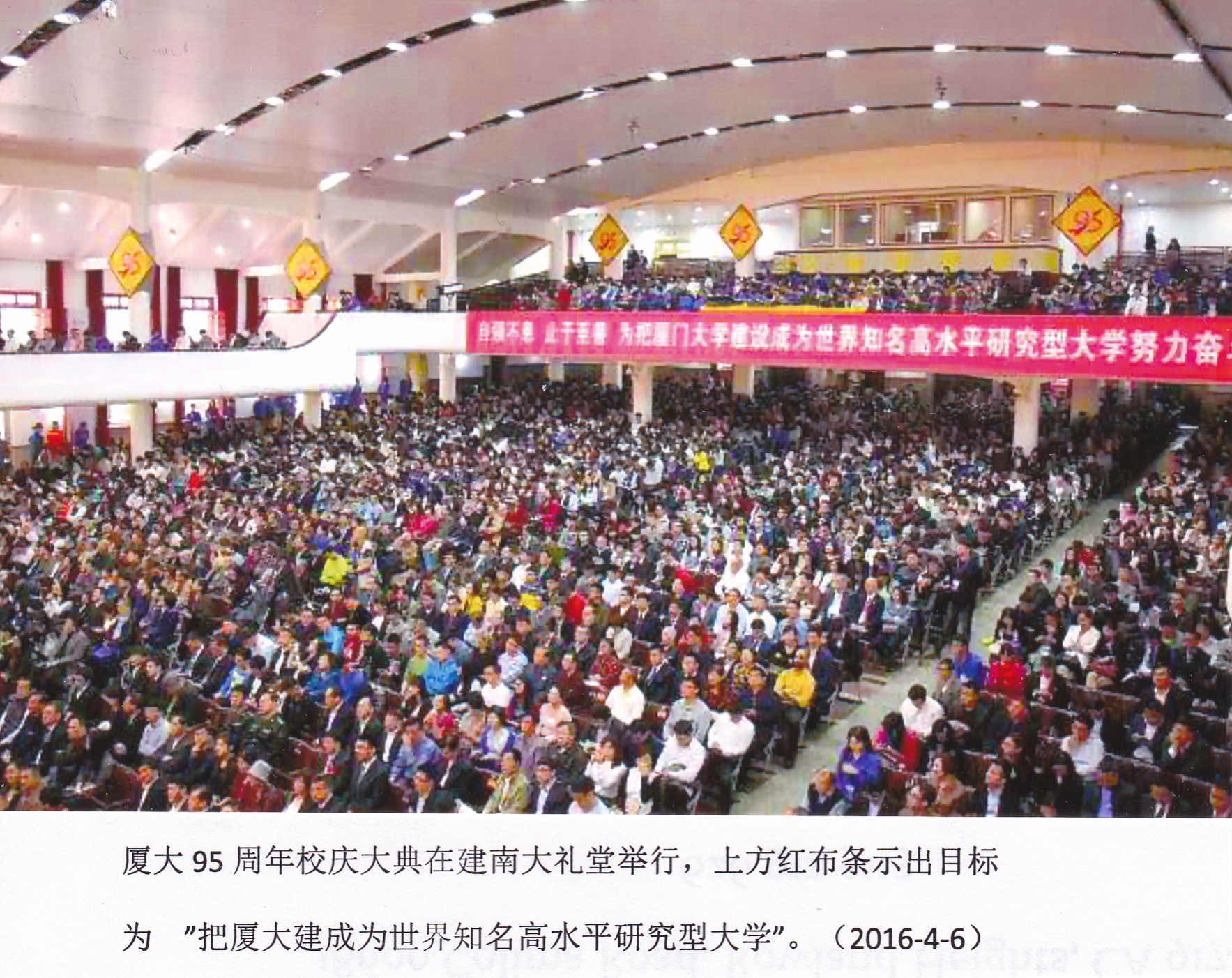 建南大礼堂内、骑楼前挂了一幅红色长布条,上面写着 “自强不息 止于至善 为把厦门大学建成为世界知名高水平研究型大学努力奋斗“,这是母校为 ”走进世界”而努力的中心目标,故從85周年校庆时起就一直挂在那里。