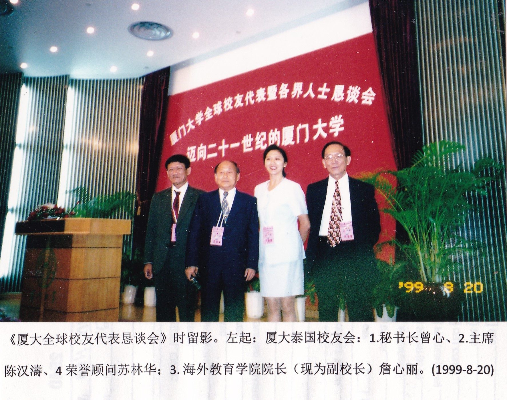 1999年8月20日厦大暑假期中,我应其时校长陈传鸿及党委书记王豪杰之邀,到深圳参加第一届 《厦门大学全球校友代表暨各界人士恳谈会》。这项活动,颇意味着厦大要透过这项活动与世界各地校友会接轨,有助于厦大走进世界。在会议期间,我们三位来自泰国代表(即:泰国校友会主席陈汉涛、秘书长曾心及我因来自美国、故担任该会名誉顾问)有幸认识厦大海外教育学院詹心丽院长,知她便是厦大走进世界之一先行者。