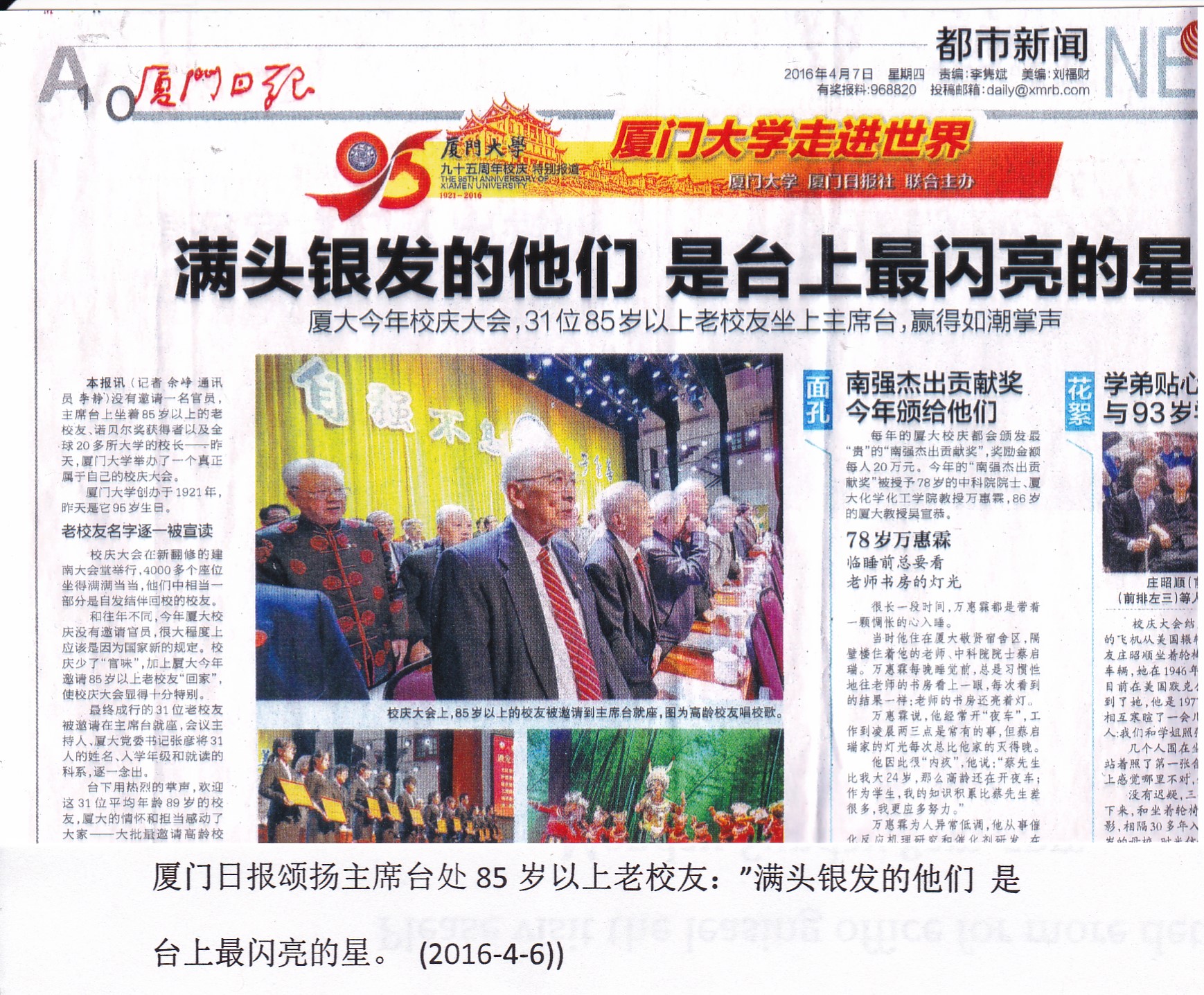 唱校歌时全场肃立,这时看到一位记者在我右侧来回走动,似要拍下最佳亮点。次日见到厦门日报刊出我们好几位老年校友并立的照片、文字标题是 “满头银发的他们 是台上最闪亮的星“。我有幸和左侧的陈振苍、谢希文,和後排的蔡厚示等都被拍到。