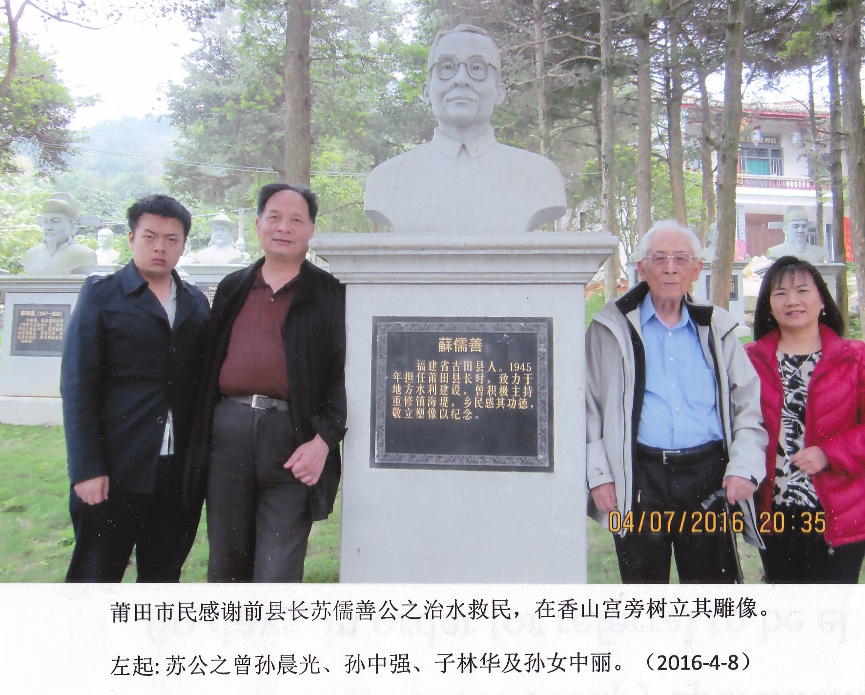 而今日厦大95周年校庆後,我侄再带我到莆田,这次则是山景区香山宫旁树林间,该市居民对地方有特别贡献人士树立下24座雕像,家父纪念像在第一排。(现附我们祖孙三代与家父苏儒善公石像合影于此。)----毕竟人民感恩、永运怀念着他的!