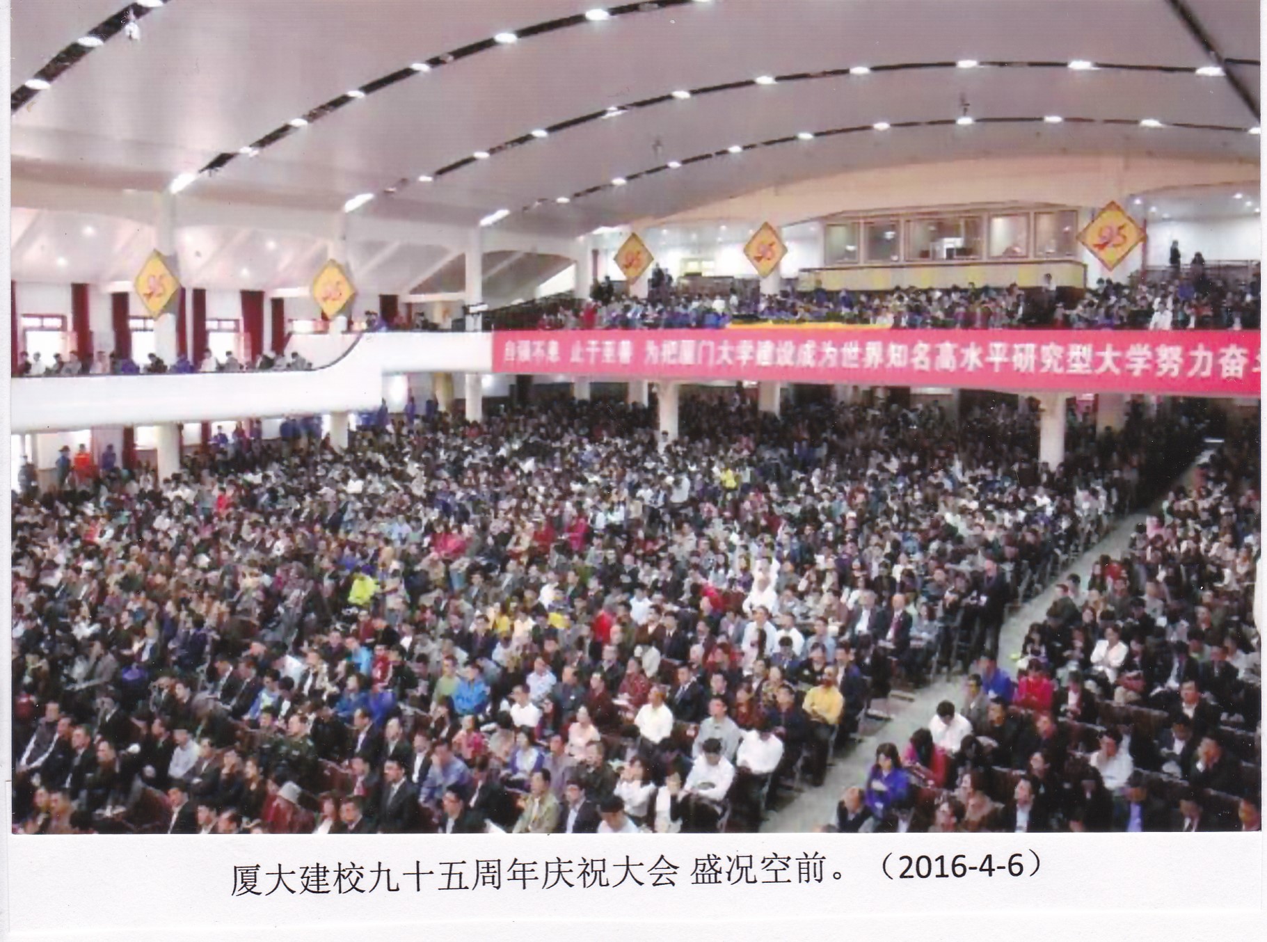 溯自1999年8月母校在深圳市举行「厦大全球校友恳谈会」为始、继而80周年、85周年及90周年校庆,我因被校方列为「知名校友」,故均得到校长和党委书记之联名邀请参加盛典。但去年 (2015年) 11月中,则由校友总会秘书处发函给各地区校友分会,嘱先行提名85岁以上有意参加95周年校庆之校友名单,条件有四:(1) 须厦大毕业者 ─ 我为1948届者;(2) 须为1949年前入学者 ─ 我为1944年在长汀入学者;(3) 须身体健康可行 ─ 我近年經医生检查均称正常,但「可行」二字之解释颇费周章,因我已不易爬高及快步行走,如要走长路必须用手扙,仍冒着被「拒邀」之危险、据实以告;(4) 须有家人陪同 ─ 早于2015年初、我儿中弘即有意陪我到厦大,不意去年11月9日竟因胰腺癌过世,长女中慧虽也在南加州、但忙于事业,故征得远在德克萨斯州之次女中丽专程来援。