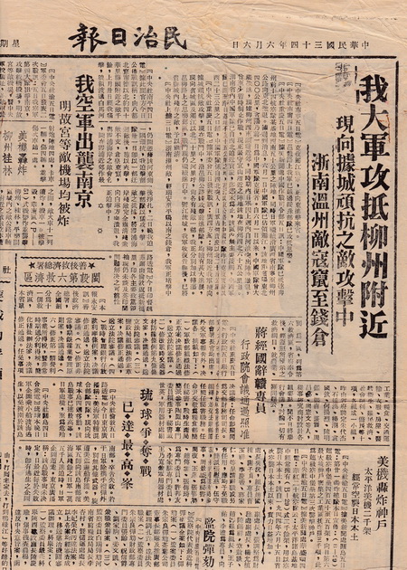 我大军攻抵柳州附近,现向据城顽抗之敌攻击中。浙南温州敌寇窜至钱仓。
