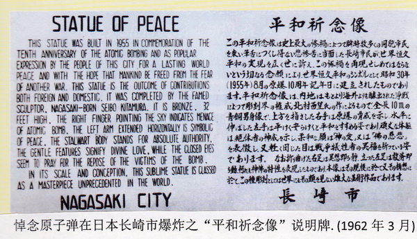 讲习会第二月份课程完毕时,我和各国研修生南下长崎市(Nagasaki City),参观迫使日本投降的第二颗原子弹“原爆中心”,在“平和祈念像”(Statue of Peace)前合影。按:此巨像建于“原爆”十年之后(即1955年时)由长崎市著名雕塑家北村西望制作,它高32英尺,肃然而坐,有神圣感;右手指向天空,示防原子弹;左手平伸,意盼和平;双目紧闭,似为弹下丧生者祈福。但最重要者是像下说明牌上的一句话,即:“此祈念像是长崎市民期望世界永久和平,希望人类不再有战争的共同心声”。——正是“前事不忘,后者之师”,深望现之日本执政者,不要忘记七十年前的惨痛教训,深切反省,不要再挑战,要尊重长崎市民的期望,人类的期待,永保世界和平。