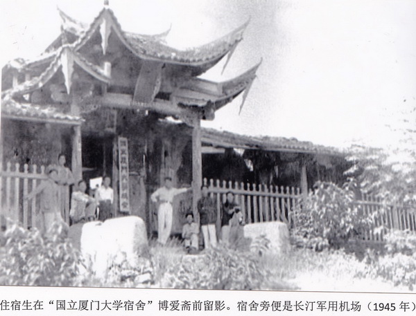 九月份厦大开学前,校方为我们大一新生安排宿舍,一是在校本部的“同安堂”,它虽然去年被日机炸中,但因近校中心,为大多数级友看中;另一为离校本部约二十分钟行程的“博爱斋”,它建在山腰上,隔着一个山脊和长汀军用机场相邻,但据航空总监判断,除非日机想撞山,博爱斋是最安全的。于是我们这5位英华保送生,加上一位自行投考的林坚冰(数理系),都从1944年9月到1945年9月间,也就是抗战最后一年(第八个年头)和博爱斋生死与共地住在一起。