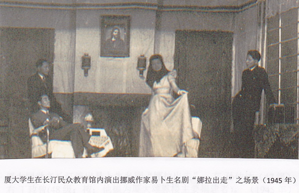 长汀暂时安定下来,我们依然弦歌不绝。寒假期间,英华校友还在市内民众教育馆内,为亡师陈衡庭家人筹募生活基金而演出易卜生名剧“娜拉出走”。英华和华南女子中学校友们还在厦大校本部院系办公处“集思堂”前之广场留下个大团体照。