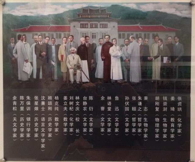 厦大广为人所知的校训“自强不息,止于至善”、校歌、校徽等,都是在林文庆时代确定的。他致力于学校的行政与学科建设,重金礼聘知名教授,一时群贤毕至,名流云集,组成了一支力量雄厚的师资队伍。如语言文字学家沈兼士,文学家林语堂、鲁迅、孙伏园、陈衍、台静农、余謇,哲学家张颐、朱谦之,历史学家顾颉刚、张星烺、陈万里,数学家姜立夫、杨克纯,物理学家胡刚复,化学家刘树杞、张资珙,生物学家秉志、钱崇澍,天文学家余青松,银行学家朱保训,教育学家姜琦等都先后来校任教。至1930年6月,全校共设5个学院21个学系,初具规模。油画中的人物正是上述提到的这些名流教授等。