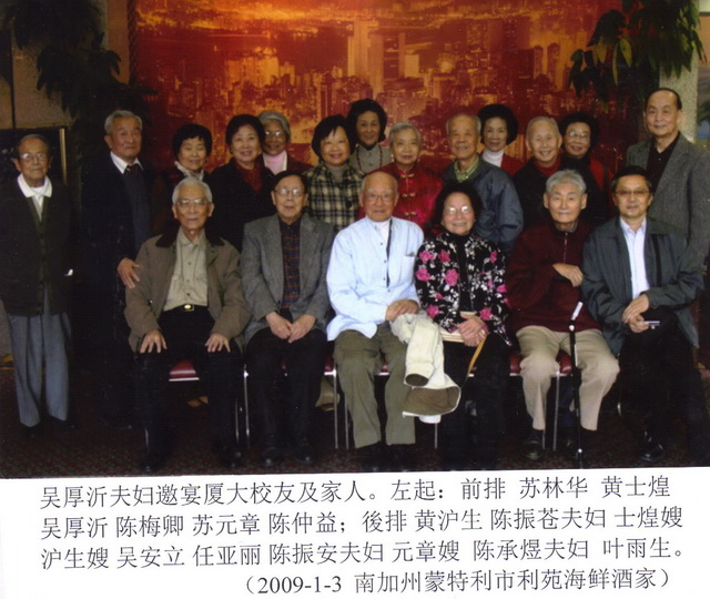 2008年12月初,新泽西州的吴厚沂、陈梅卿俩学长到南加州圣地牙哥女儿安宜家避寒三个月,特邀厦大校友于2009年1月3日新春时节到蒙特利公园市利苑海鲜酒家大团聚。我因已不再驾车,承1947级的陈振苍夫妇陪我搭公车才得到场;吴学长夫妇则由女与婿及家人护送前来,宴开二桌,参加者计19人,宴毕合影留念(即左起,前排:苏林华、黄士煌、吴厚沂、陈梅卿、苏元章、陈仲益;后排:黄沪生、陈振苍夫妇、士煌嫂、沪生嫂、陈吴安宜、李任亚丽、陈振安夫妇、元章嫂、陈承煜夫妇、叶雨生)。但自这次后,我就再无法见到吴学长之面了。