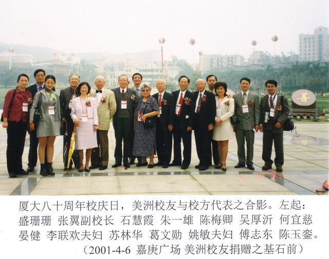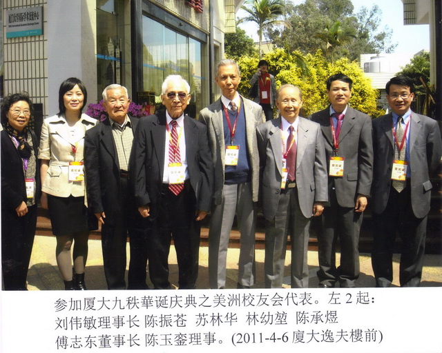 2011年4月6日厦大建校九十周年庆典,美洲校友会在傅志东董事长和刘伟敏理事长推动下,有40位校友与眷属参加,包含了“七老八十”的阵容(按,有七位超过八十岁的老校友参加,即:庄昭顺、朱一雄、陈承煜、林幼堃、陈振苍、张德光及我苏林华),值得纪念(现附照片于此)。惜朱一雄学长已于2013年3月间在新泽西州过世了。
