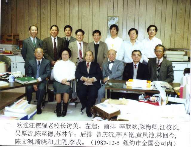1987年12月初,忽接吴厚沂学长来电,说该星期天,即12月5日,原厦大汪德耀校长要到纽约市,嘱我夫妇和李齐昆夫妇是日11时前到达其金国食品公司。遂自宾州先到新州李兄处,再由他开车带我们三人前往,在金国公司二楼处拜见汪公。不久校友们到齐,遂整理好三楼会计室,汪校长和学生们计14人用我的相机拍个合影,后黑白者刊在校友通讯第三期上,彩色者刊在第五期上。(按拍照时,左起前排:李联欢、陈梅卿、汪校长、吴厚沂、陈至德、苏林华;后排:曾庆沅、李齐昆、黄凤池、林回今、陈文渊、潘晓和、庄堤、李戎)。