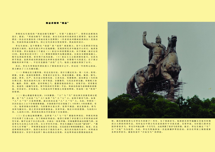 (一)准确定位主题形象。经过反复讨论,设计主题定位为:统一大业、胜利、骄傲、自豪,高扬民族精神,形象设计定位为:郑成功戴盔、着袍、佩剑、骑马,成就、神圣、庄严,充分显示统帅风度、王者风范、英雄精神,面向群众(当时的台湾父老,现在的泉州人民)招手致意,含蓄微笑,与民众亲密交融;坐骑屹立如塔,巍然、伟然、威然,富有阳刚之气,蕴蓄着强劲的伟力。表现手法:采用象征性、寓意性(超越写实性、情节性的时空界限)手法,郑成功的战马前蹄踏荷虏钢盔,昂首前行,步伐豪迈,与郑成功举手侧望之英姿相辉映,形成统一的“胜利”的情调。