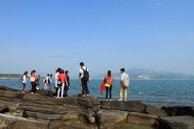 蓝天白云的晴空映衬着葱郁的树林,灿烂的阳光照耀在黄棕色的岩石上,清澈的海水拍打着海岸,大家彷佛瞬间忘却了工作、学习上的压力,情不自禁地放慢了脚步,全情投入到原生态的美景之中。