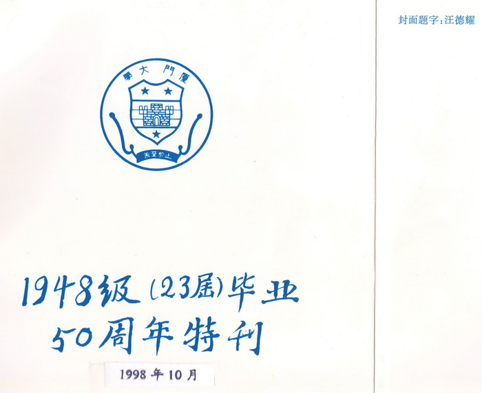 之后我们要出《1948级(23届)毕业50周年特刊》我建议级友会主编陈华兄出面向汪老校长请求题字,终于得到汪公墨宝,作为1948级及其它受教学生们的永久纪念。为了证明这是汪校长真迹,我把扉页打开,和封面一起印出来。